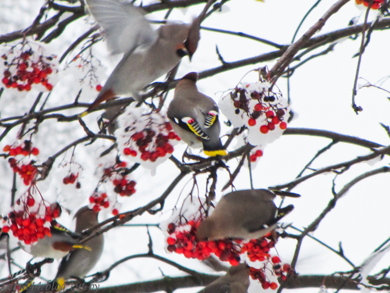 У нас тут на днях тоже эти пташки налетели и всю рябину слопали. А под деревом кот сидел и так уж на них смотрел жадно. Я всё ждал, когда же он полезет охотиться